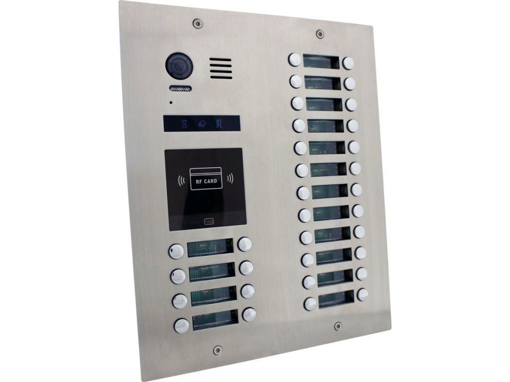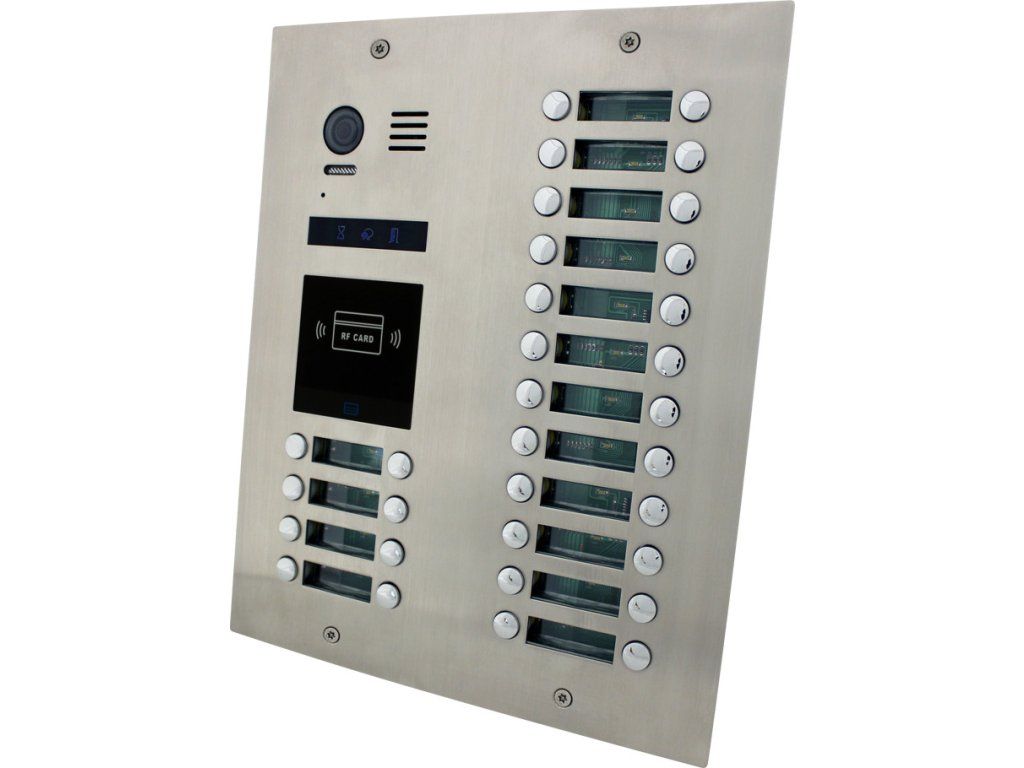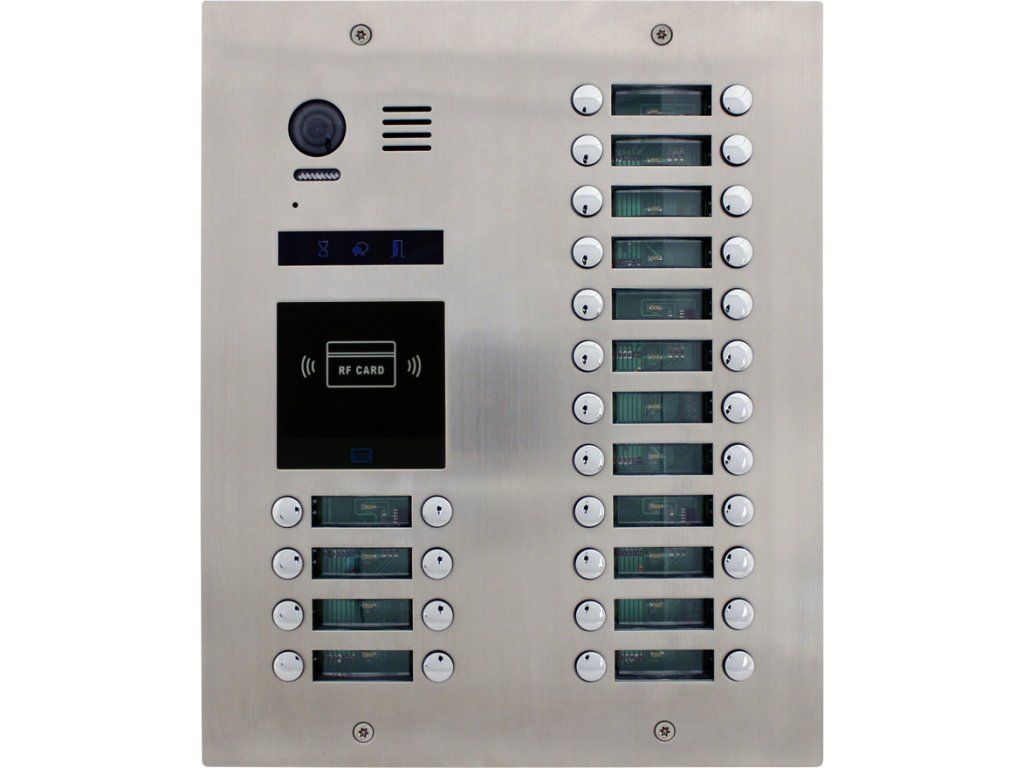 Jednostka drzwiowa, wideo, 32 przyciski, antywandalowa, podświetlane etykiety z nazwiskami, wskaźnik statusu połączenia, konstrukcja ze stali nierdzewnej, białe oświetlenie LED skanowanego obszaru, kolorowa kamera,kąt widzenia 105°, Stopień ochrony IP 43, przekaźnik 12 V DC lub NO/NCsterowanie 1 zamkiem, (możliwość dodania modułu RLC dla drugiego zamka), regulowany czas otwarcia 1–99 s,wbudowany czytnik kart RFID 125 kHz(pojemność 1000 użytkowników, możliwość przypisania i edycji breloka do konkretnego mieszkania),możliwość tworzenia kopii zapasowych kart dostępowych i chipów,Wymiary 257 x 316 x 52 mm, montaż podtynkowy, 2x puszka montażowa, zasilanie 24 V DC z magistrali systemowej, układ połączeń dwużyłowy – niepolaryzowany, zalecana skrętka nieekranowana min. 2 x 1 mm, do prawidłowego działania systemu należy zastosować zasilacz LRS-100-24
