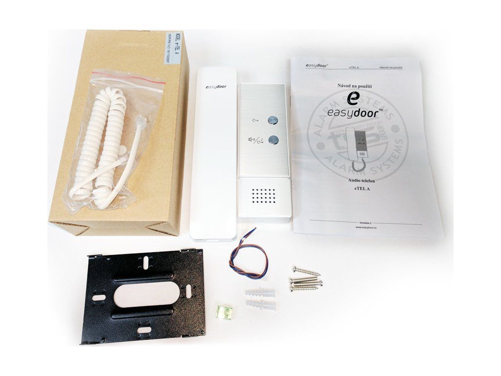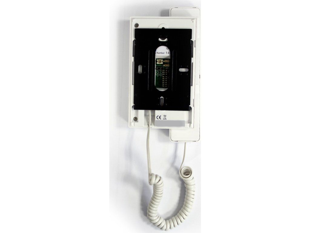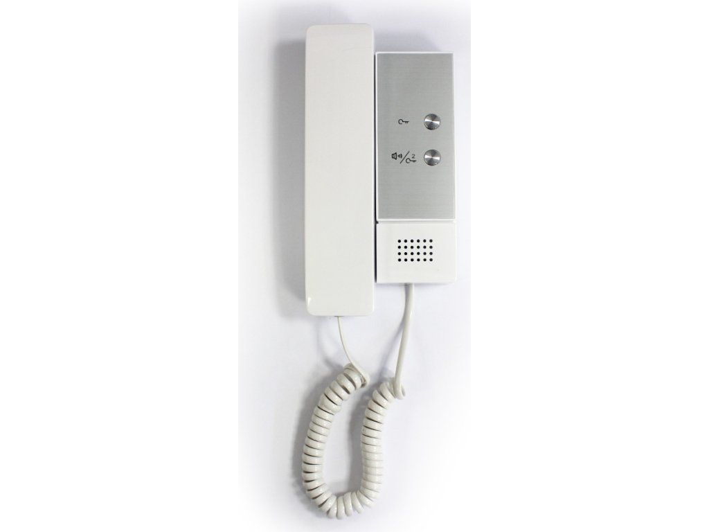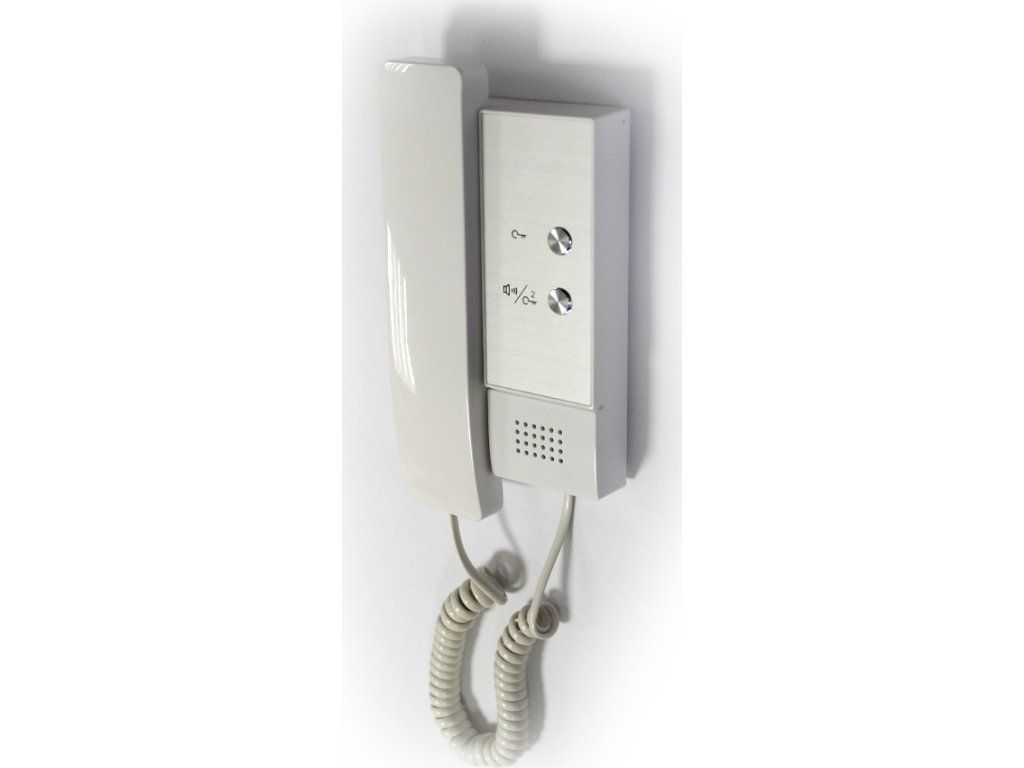 Audiofon Easydoor ze słuchawką,konstrukcja z białego plastiku / aluminium, bez wyświetlacza, przyciski mechaniczne,bez pamięci,połączenia grupowe na wielu monitorach w mieszkaniu, dodatkowy kontakt dzwoniący z drzwi mieszkania,niezależne sterowanie 2 zamkami, adresowanie przełącznikami DIP, zasilanie 24 V DC z magistrali systemowej (zalecana skrętka min. 2x 1 mm), montaż natynkowy, wymiary 97 x 187 x 33 mm, zastosowanie wewnętrzne
