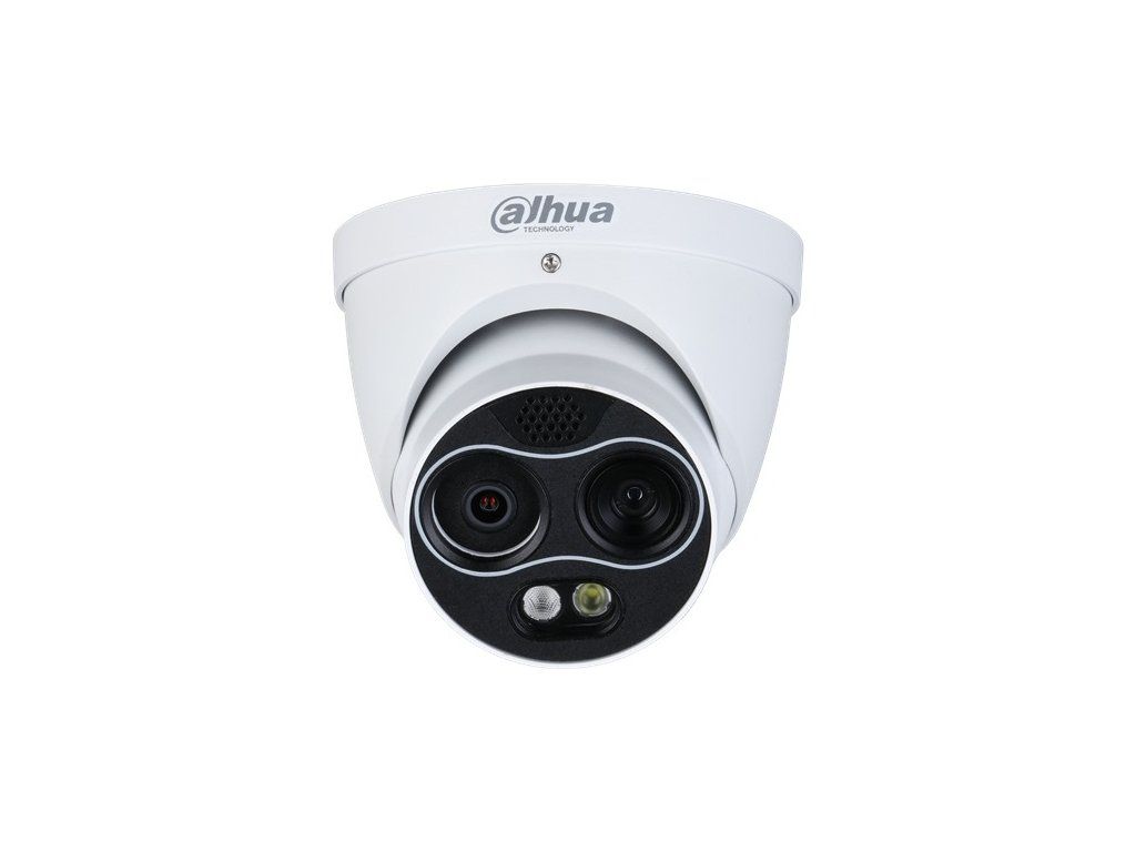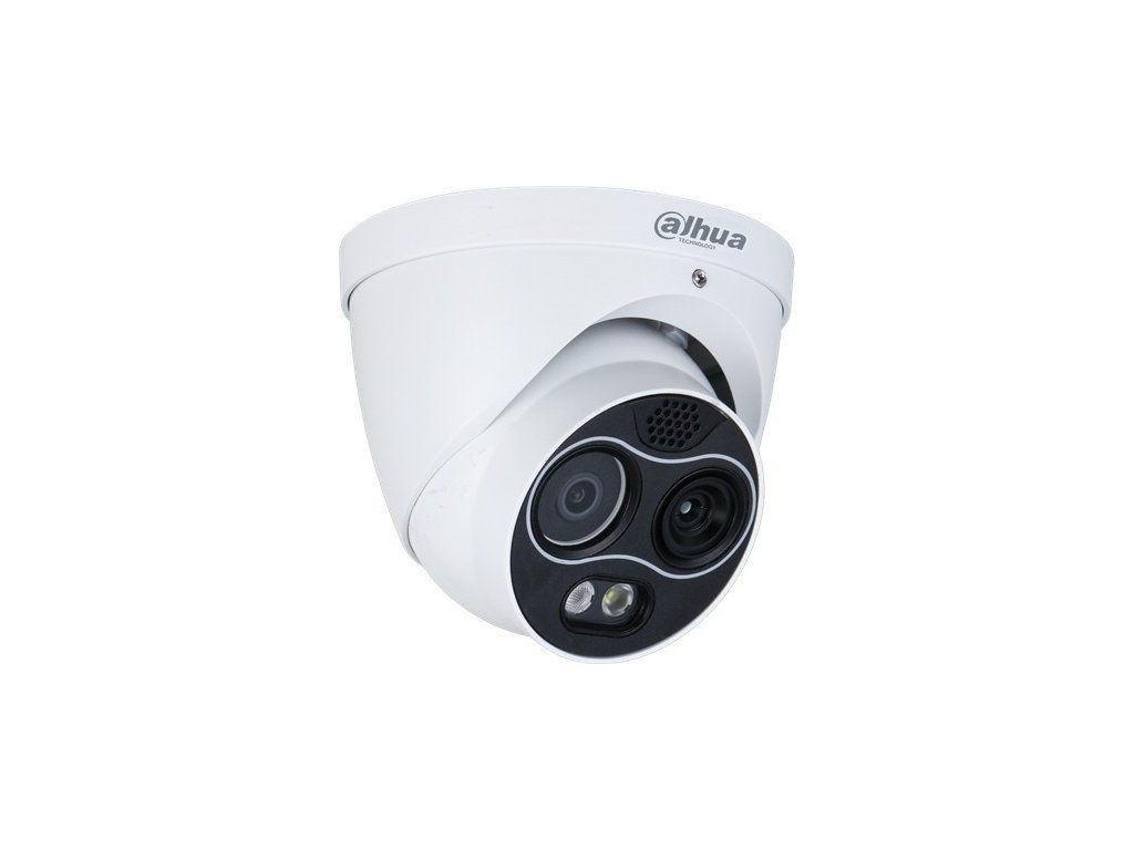 Hybrydowa kamera termowizyjna z wieżyczką, zewnętrzny, czujnik, tlenek wanadu, niechłodzony detektor płaszczyzny ogniskowej,rozdzielczość obrazowania termicznego 256 × 192 px @ 1–25 kl./s, czułość termiczna <40 mK @ F1.0,zakres widmowy 8–14 µm, odstęp między pikselami 12 µm, soczewka 2 mm, kąt widzenia: H: 87,8° V: 63,8°, AGC, 3D NR;rozdzielczość widzialnego spektrum 1/2,7 CMOS 4 Mpx (2336 × 1752 px) @ 1–25 kl./s, obiektyw 2 mm, czułość 0,05 luksa (kolor) F2.2, pole widzenia H: 94°, V: 72°, AWB, AGC, BLC, HLC, DWDR, 3D NR, RoI; oświetlenie IR 30 m; kompresja H.265 / H.264 / H.264H / MJPEG; ONVIF;Inteligentne funkcje: Ochrona obwodowa, Alarm wykrywania ciepła, Wykrywanie zimnych i gorących punktów, Klasyfikacja osób i pojazdów, Wykrywanie dymu, Wykrywanie połączeń telefonicznych, Pomiar temperatury; wejście/wyjście alarmowe 2/2, wejście/wyjście audio 1/1, 1× RS-485,Gniazdo na kartę MicroSD 256 GB, zasilanie 12 V DC 1A / PoE (802.3af), pobór mocy maks. <10 W, wymiary 122 × 122 × 112 mm, temperatura pracy od -30 °C do +60 °C, waga ≤0,85 kg.