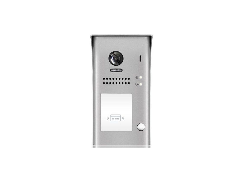 Kamera drzwiowa, kolorowa, z jednym przyciskiem i czytnikiem RFID 125 kHz, pojemność 320 kart, podświetlana tabliczka znamionowa i wskaźnik LED, metalowa obudowa, oświetlenie skanowanego obszaru, kamera szerokokątna 170°, IP 43, 12 V DC lub sterowanie przekaźnikiem dla 1 zamka, dodawanie/usuwanie kart za pomocą kart master, wymiary 179 x 94 x 42 mm, z daszkiem, zasilanie 24 V DC z magistrali systemowej, montaż natynkowy, dwuprzewodowy system połączeń - niepolaryzowany, zalecana skrętka nieekranowana, min. 2x 1 mm