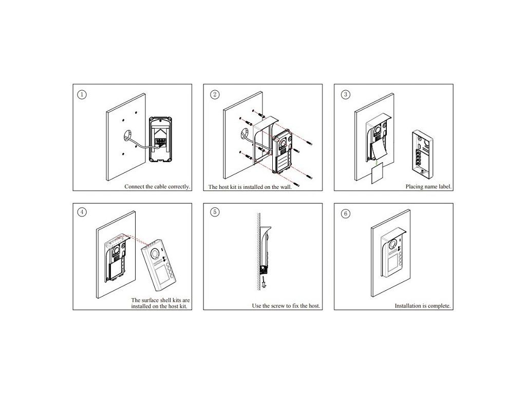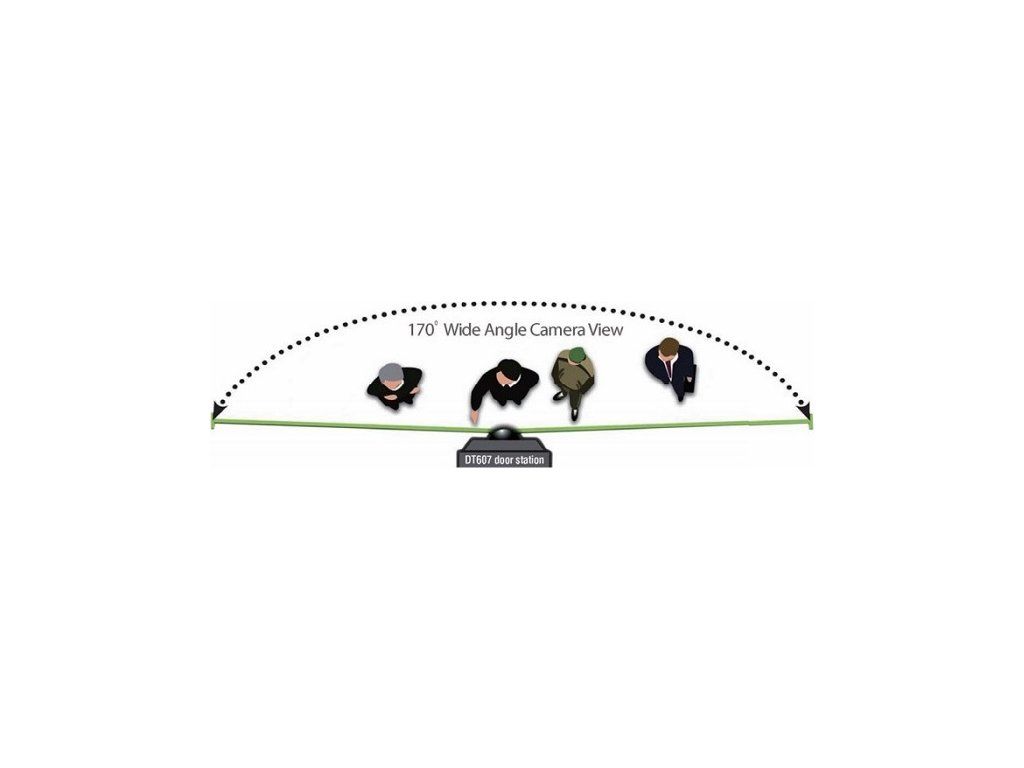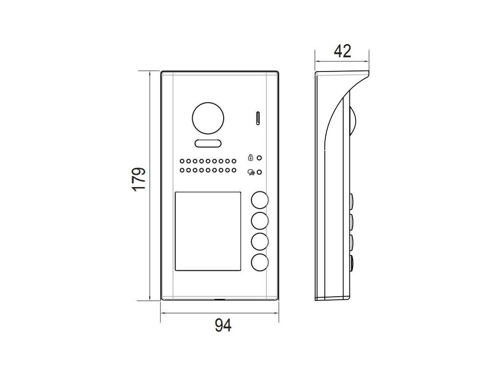 Kamera drzwiowa, kolorowa, z czterema przyciskami i czytnikiem RFID 125 kHz, pojemność 320 kart, podświetlana tabliczka znamionowa i wskaźnik LED, metalowa obudowa, oświetlenie skanowanego obszaru, kamera szerokokątna 170°, IP 54, 12 V DC lub sterowanie przekaźnikiem dla 1 zamka, dodawanie/usuwanie kart za pomocą kart master, wymiary 179 x 94 x 42 mm, z daszkiem, zasilanie 24 V DC z magistrali systemowej, montaż natynkowy, dwuprzewodowy system połączeń - niepolaryzowany, zalecana skrętka nieekranowana, min. 2x 1 mm