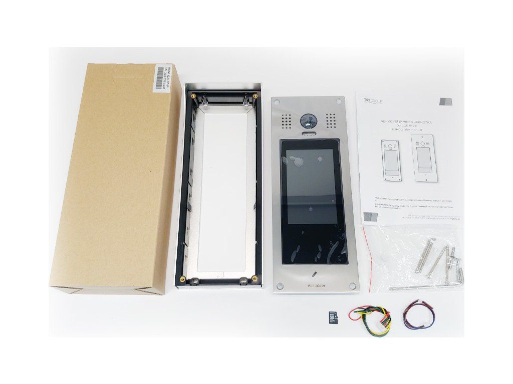 Jednostka drzwiowa IP, wideo, ekran dotykowy 5", opcja książki telefonicznej, bezpośrednie wprowadzanie adresu, odblokowywanie kodem, RFID 125 kHz i MIFARE 13,56 MHz, oświetlenie LED skanowanego obszaru, kamera typu rybie oko,Kąt widzenia 170°, IP 65, 12 V DC / 300 mA i przekaźnik NO/NCsterowanie 2 zamkami, regulowana długość otwarcia, elektronicznie regulowany adres IP, interfejs do obsługi i aktualizacji monitorów bezpośrednio z jednostki drzwiowej, wymiary 281 x 110 x 44 mm, z daszkiem, montaż natynkowy,Zasilacz PoE 802.3af