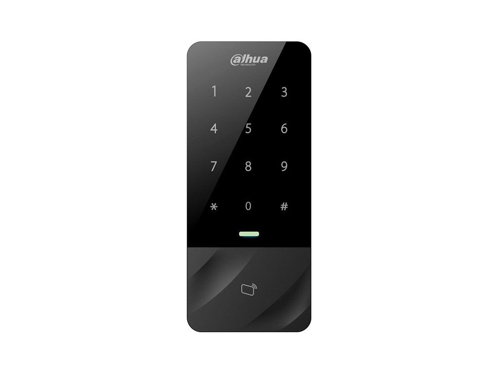 Autonomiczny czytnik dostępu RFID z klawiaturą kodową, odczyt kart zbliżeniowych (MIFARE, 13,56 MHz), pojemność 30 000 użytkowników, 60 000 rekordów, możliwość podłączenia dodatkowego czytnika RFID Dahua z przeciwnej strony drzwi (funkcja Pass Back), sterowanie zamkiem 1x NO/NC, możliwość podłączenia przycisku wyjścia i czujnika drzwi, zabezpieczenie antysabotażowe,Połączenie TCP/IP i zarządzanie za pomocą inteligentnego oprogramowania dostępowego PSS, sygnalizacja dźwiękowa i LED, zasilanie 100 mA / 9 –15 V DC (zasilacz nie jest dołączony), IP 67 do stosowania na zewnątrz i wewnątrz, tworzywo sztuczne, montaż natynkowy, wymiary 62 x 142 x 23 mm