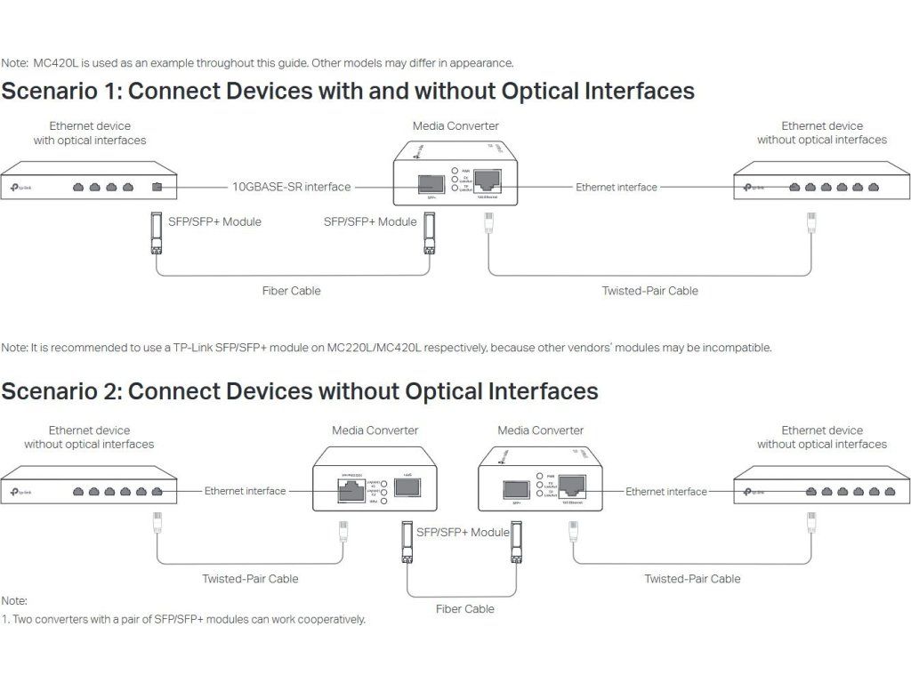 Konwerter mediów metalowo-optycznych o dużej szybkoścido 10 Gb/sto idealne rozwiązanie do transformacji sygnału między światłowodem a kablem metalowym. Posiada jedenPort Ethernet 10 Gb/si optyczneGniazdo SFP+, co umożliwia współpracę z wielomodowymi i jednomodowymi kablami optycznymi zakończonymi złączami SC/LC (w zależności od modułu optycznego). Elastyczna instalacja pozwala na ustawienie na blacie lub integrację z obudową TP-Link MC1400. Przednie wskaźniki LED zapewniają podgląd stanu sieci i ułatwiają monitorowanie w czasie rzeczywistym.