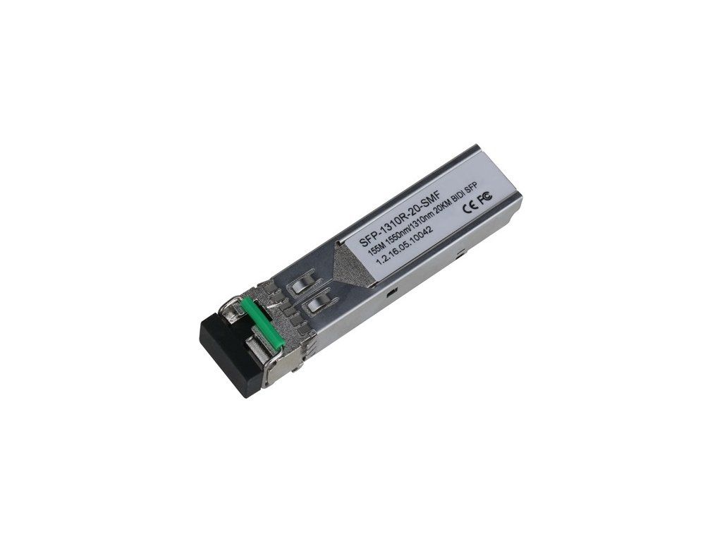 Moduł optyczny, złącze LC, jednomodowy, 100 Mb/s, 1550/1310 nm, 20 km. Do prawidłowego działania wymagany jest odpowiednik SFP-1310T-20-SMF. Temperatura pracy od -40°C do +85°C. Wymiary 56,5 x 13,4 x 8,5 mm.