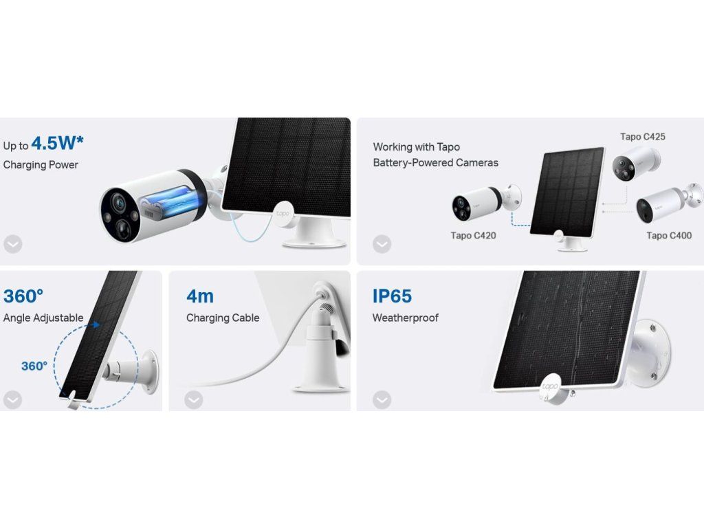 Panel słoneczny Tapo A200 zapewnia stałe źródło zasilania dla kamer bezprzewodowych Tapo (C425, C420, C400) poprzez pozyskiwanie energii słonecznej. Dzięki ładowaniuo mocy do 4,5 W, z napięciem wyjściowym 5,2 V i wysokiej jakości monokrystalicznymi ogniwami krzemowymi, zapewnia wydajne i stałe źródło zasilania. Trwała konstrukcja zCertyfikat IP65Zapewnia doskonałą wodoodporność i pyłoszczelność, co umożliwia stosowanie na zewnątrz.Kabel 4 mze złączem micro USB i uchwytem regulowanym w zakresie 360°, umożliwiającym elastyczną instalację.