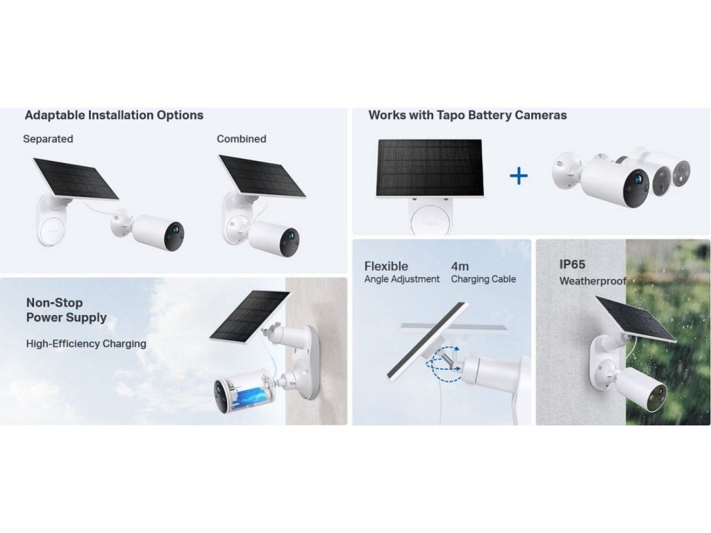 Panel słoneczny Tapo A201 zapewnia stałe źródło zasilania dla kamer bezprzewodowych Tapo (C410, C420, C425) poprzez pozyskiwanie energii słonecznej. Dzięki ładowaniuo mocy do 2,5 W, z napięciem wyjściowym 5,2 V i wysokiej jakości monokrystalicznymi ogniwami krzemowymi, zapewnia wydajne i stałe źródło zasilania. Trwała konstrukcja zCertyfikat IP65Zapewnia doskonałą wodoodporność i pyłoszczelność, co umożliwia stosowanie na zewnątrz.Kabel 4 mze złączem USB-C(w tym adapter micro USB)a uchwyt z regulacją 360°, zawierający gniazdo na kamerę, umożliwia elastyczną instalację.