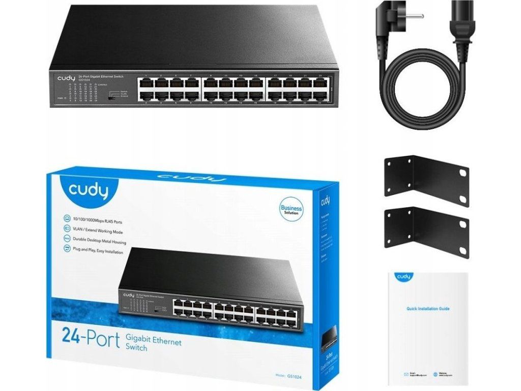 Krnąbrny24-portowy przełącznik gigabitowyW wersji desktopowej można go zamontować w szafie rack 19". Ten produkt od producenta Cudy charakteryzuje się:trwała metalowa obudowaMatowy, czarny kolor, niskie zużycie energii i prosta instalacja plug-and-play. Przełącznik to idealne rozwiązanie dla środowisk domowych i małych firm, gdzie zachodzi potrzeba przyspieszenia istniejącej sieci ze 100 Mb/s do gigabitu lub rozbudowy i podłączenia do niej większej liczby urządzeń, takich jak komputery stacjonarne, drukarki, kamery IP, telewizory Smart TV, konsole do gier i inne.