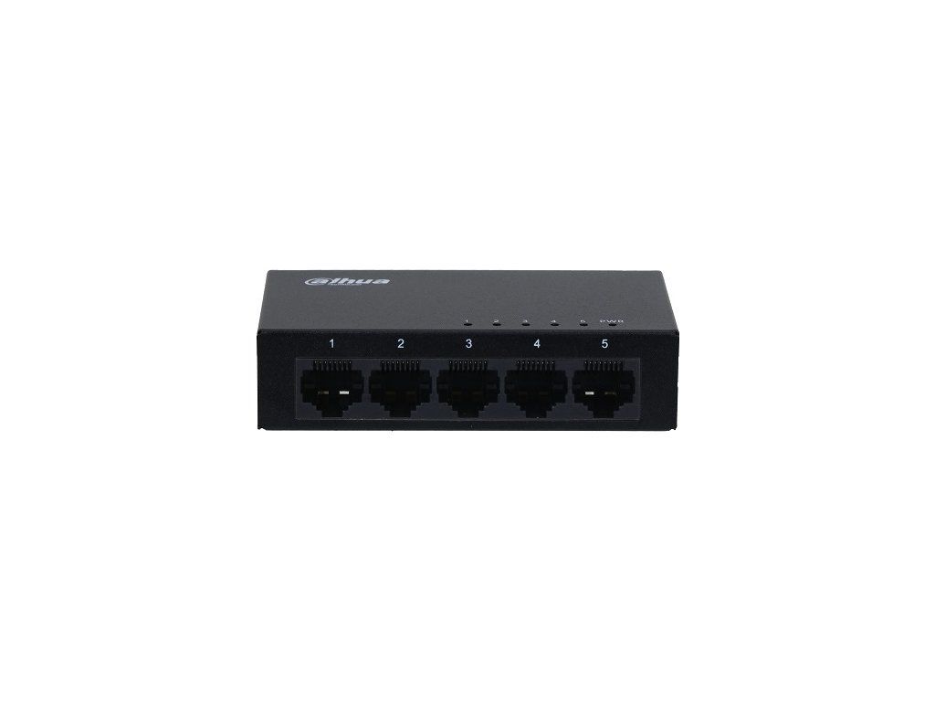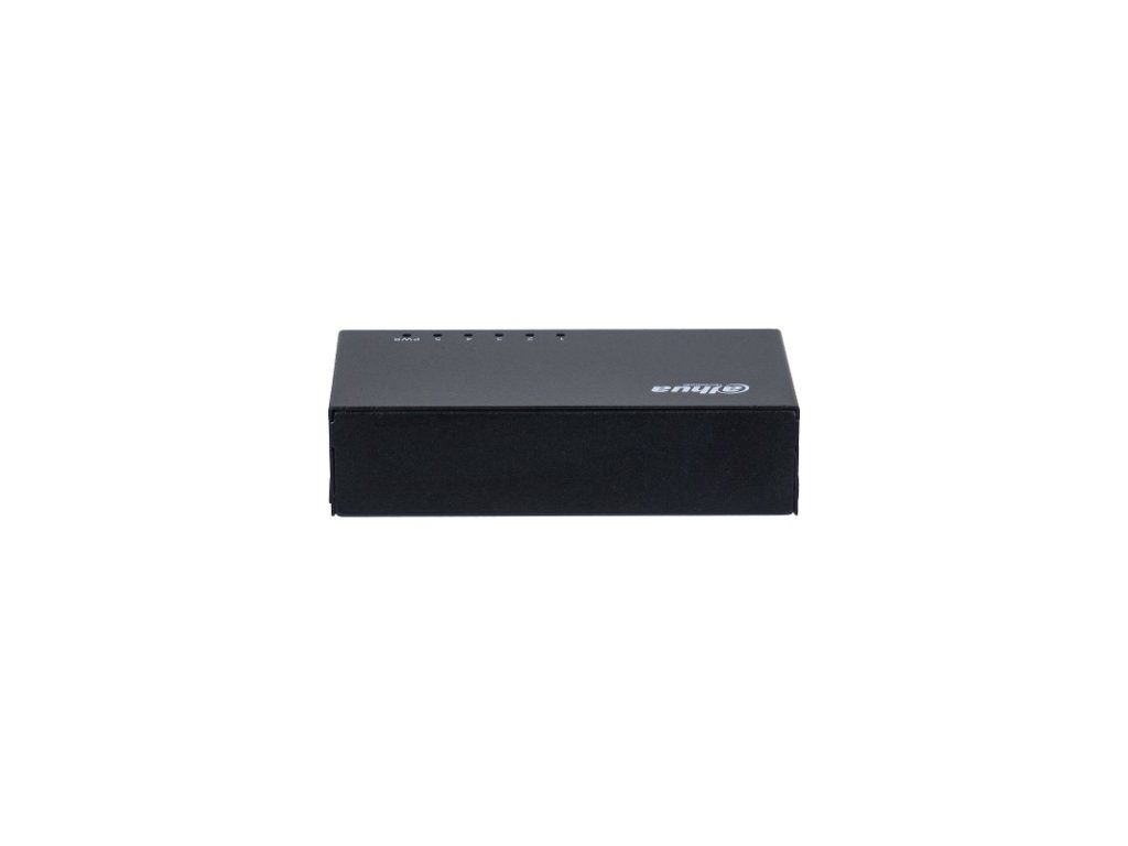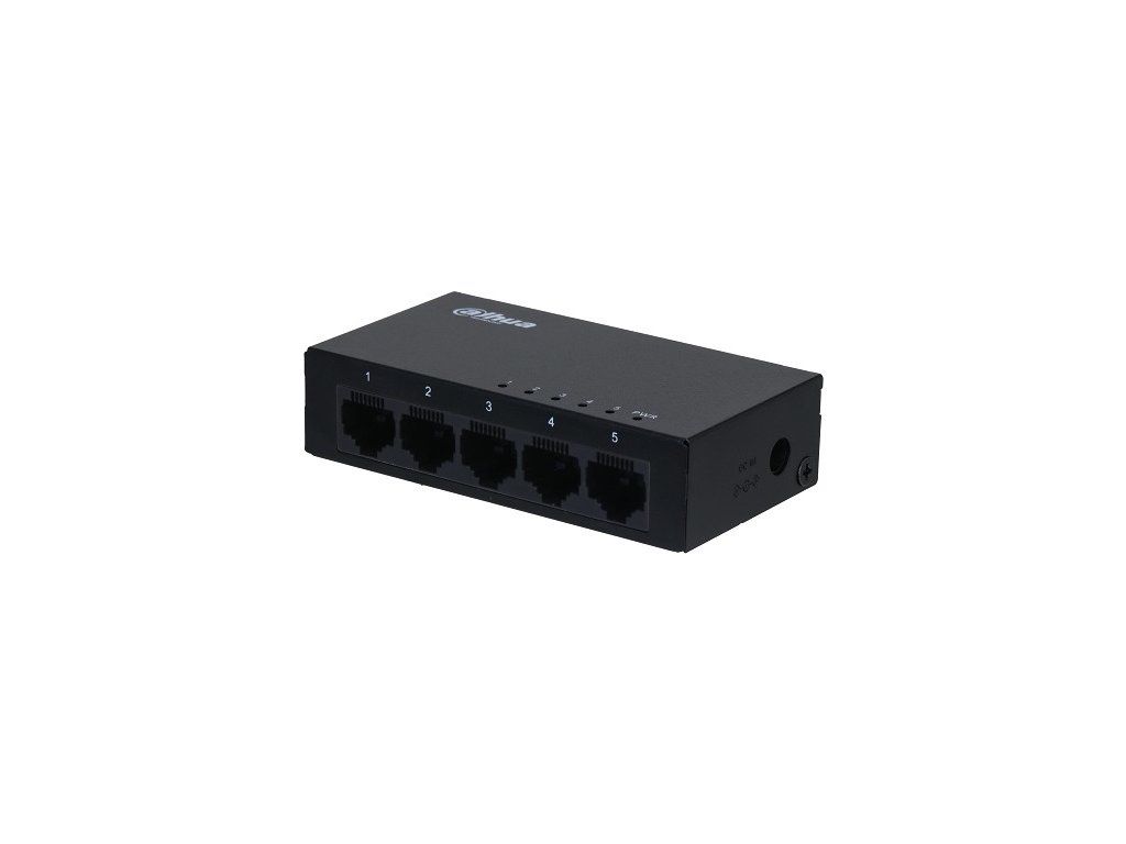 Przełącznik Dahua 5x 10/100/1000 Mb/s, zabezpieczenie przeciwprzepięciowe 4 kV, zasilanie DC 5 V / 1 A, temperatura pracy od 0 °C do +45 °C, waga 0,16 kg, wymiary 87,0 × 47,0 × 22,0 mm
