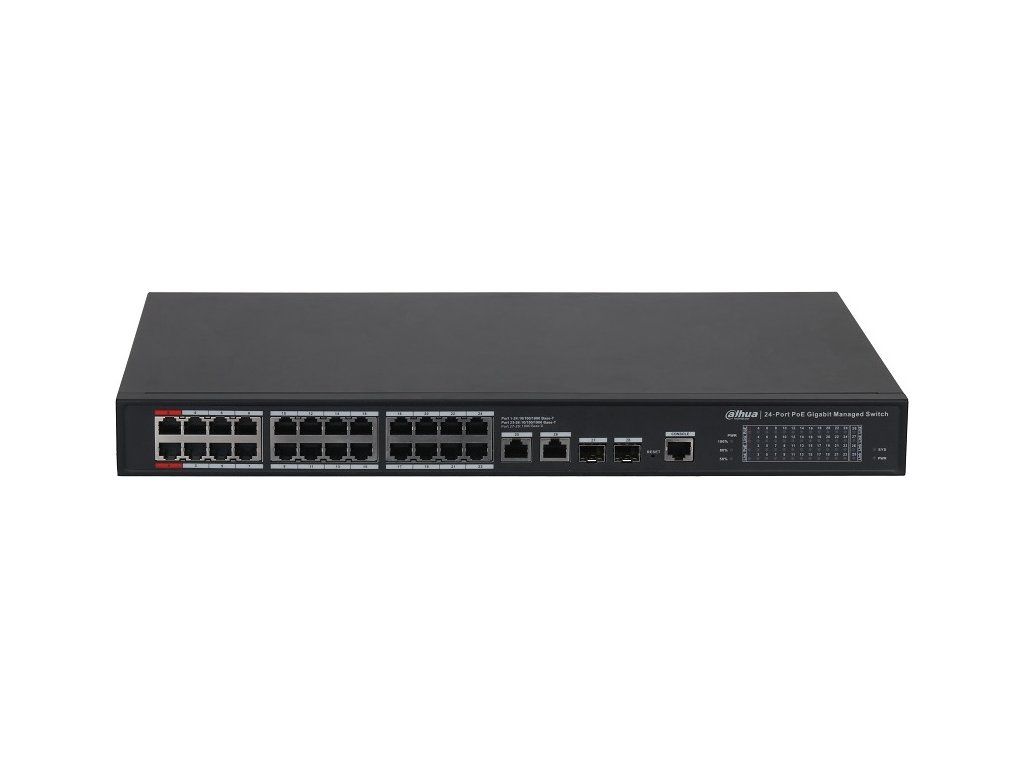 Przełącznik Dahua 24x 10/100/1000 PoE, 2x 10/100/1000 RJ-45, 2x SFP 1 Gbps, 1. i 2. port PoE++ (IEEE 802.3bt, 90 W), pozostałe porty PoE+ (IEEE 802.3at, 30 W), łącznie dla wszystkich portów 360 W, PoE o zasięgu do 250 m, Funkcje: Klient DHCP, Serwer, Snooping, STP, RSTP, Warstwa 2, tryb aktywny PD, zasilanie 100–240 VAC, 3,5 A, nadaje się do montażu w szafie, ochrona odgromowa do 4 kV, wymiary 440 x 300 x 44 mm, waga 3,405 kg