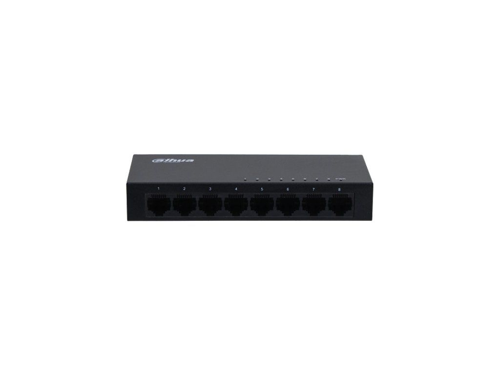 Przełącznik Dahua 8x 10/100/1000 Base-T, Pojemność przełączania 16 Gbit, zasilanie 5 V DC / 1 A, temperatura pracy od 0°C do +40°C, wymiary 133,5 x 56 x 22 mm, 0,23 kg
