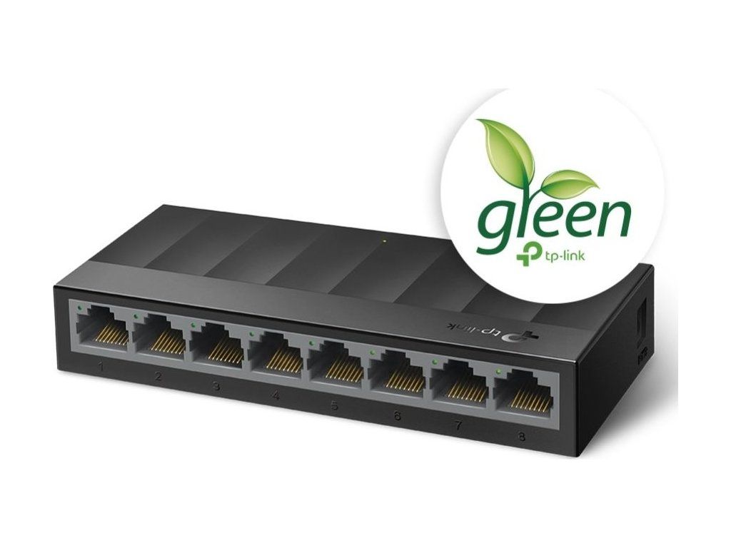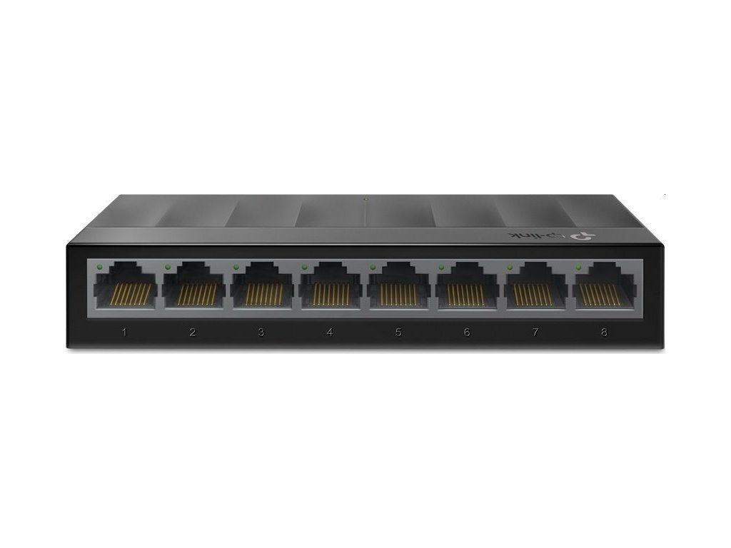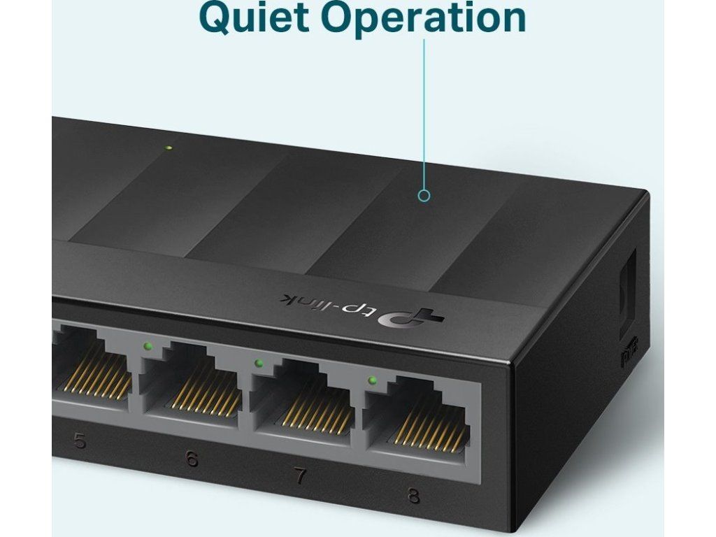 Seria LiteWave LS1008G firmy TP-Link to eleganckikrnąbrnyprzełącznik domowy w czarnej plastikowej obudowie, który ma8x Gigabitowa sieć LAN, zasilany przez złącze DC z boku, niskie zużycie energii iObsługa ramek Jumbo.