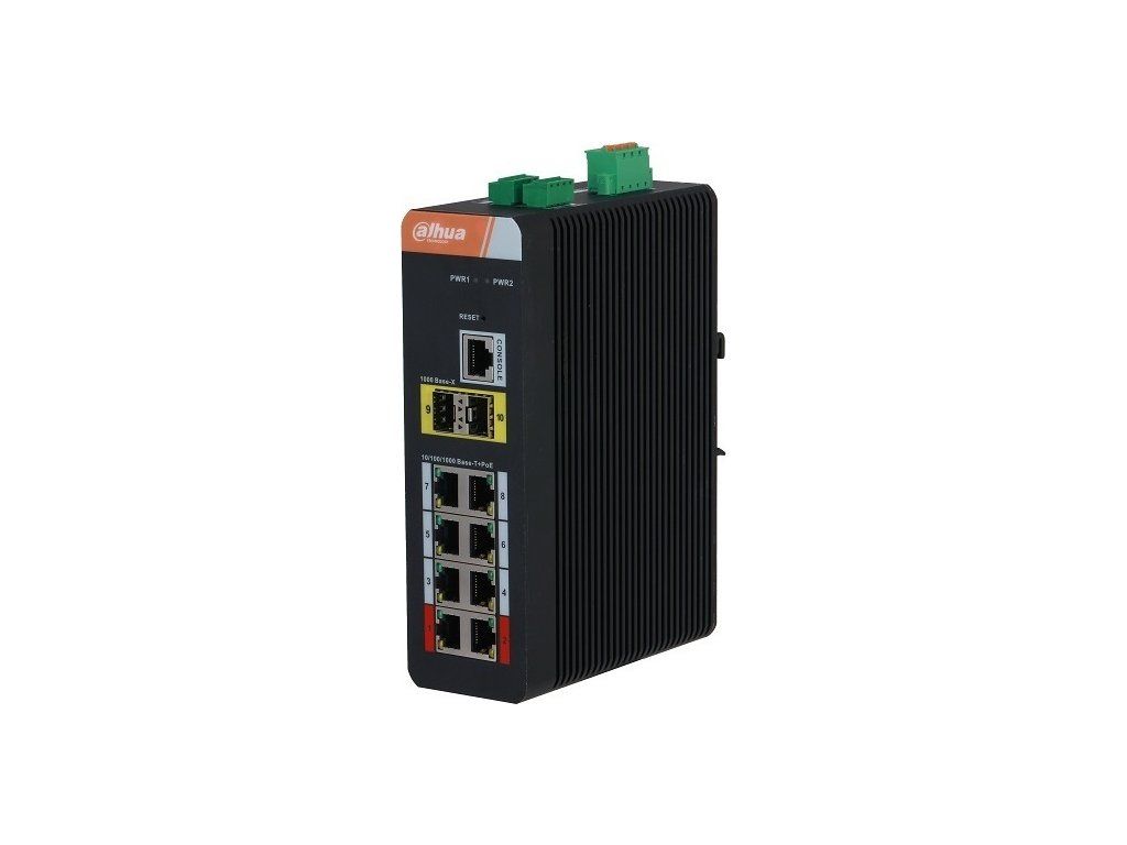 Przełącznik przemysłowy Dahua 8x 1000 Mb/s + 2x SFP Gbit + 1x port konsoli, obsługa PoE dla 8 portów, 2x PoE++ (90 W) + 6x PoE (IEEE802.3at), łącznie dla wszystkich portów 120 W, zarządzanie, obsługa STP / RSTP / MSTP, zabezpieczenie przeciwprzepięciowe 4 kV, zasilanie 48–53 V DC (zasilacz nie jest dołączony), montaż na szynie DIN, temperatura pracy od -40 °C do +75 °C, wymiary 125,0 × 53,5 × 175,0 mm, waga 1,25 kg. Przełącznik nie jest odpowiedni do kamer Avigilon.