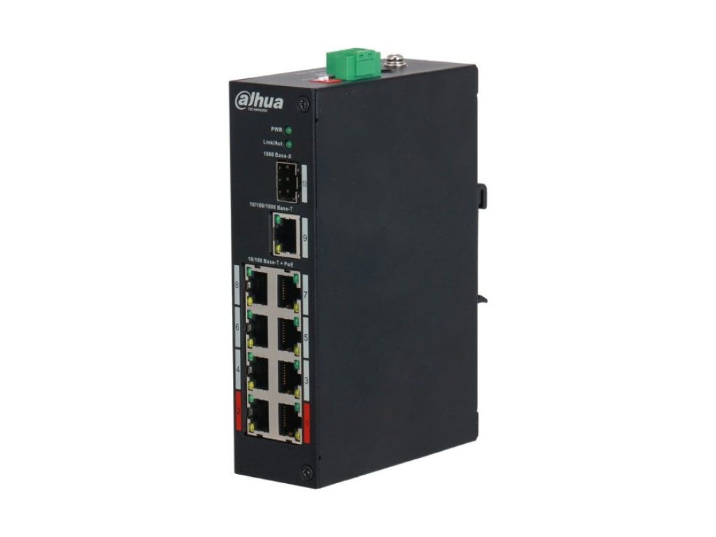 Przełącznik Dahua 8x 100 Mb/s + 1x Gbit + 1x SFP Gbit, obsługa PoE 2.0 dla 8 portów, 8x PoE (IEEE802.3af/at/bt), port 1–2 maks. 90 W, port 3–8 maks. 30 W, łącznie dla wszystkich portów maks. 90 W, PoE Watchdog, temperatura pracy od -30 °C do +65 °C, zasilanie 48–57 V (zasilacz w zestawie), pobór mocy maks. 96 W, wymiary 150 x 100 x 30 mm, waga 0,54 kg