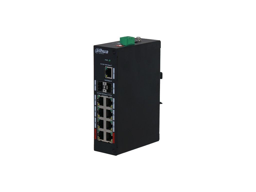 Przemysłowy niezarządzalny przełącznik Dahua 8x 1000 Mbps PoE + 2x SFP Gbit + 1x 10/100/1000 Mbps RJ-45, Obsługa PoE dla 8 portów, 2x PoE++ 90 W (port 1 + 2) i 6x PoE+, łącznie dla wszystkich portów maks. 120 W, PoE Watchdog, PoE do 250 m, ochrona przeciwprzepięciowa 6 kV, zasilanie 48–57 V DC (zasilacz w zestawie), temperatura pracy od -30 °C do +65 °C, wymiary 150 × 110 × 42 mm, waga 0,67 kg, Przełącznik nie jest odpowiedni do kamer Avigilon.