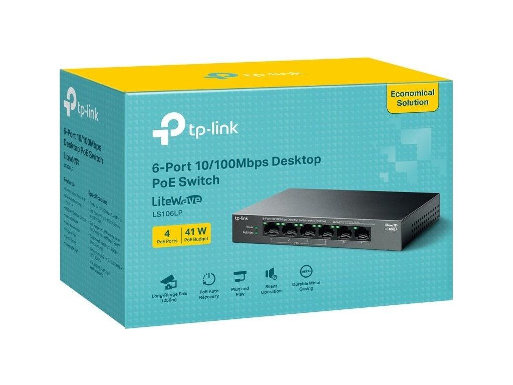 Niezarządzalny przełącznik PoE od TP-Link z(6) 10/100 Mb/sz których porty 5 i 6 bez PoE mogą służyć jako łącze w górę, a pozostałe4 porty obsługują wyjście PoEze standardem 802.3af (do 15,4 W/port). ŁącznieBudżet PoE wynosi 41 WPrzełącznik umożliwia równieżPoE w odległości 250 mPodczas przełączania specjalnego przełącznika, prędkość łącza na portach PoE spada do 10 Mb/s, co jest więcej niż wystarczające do przesyłania obrazu z kamer. Kolejną zaletą przełącznika jest możliwość przełączaniaAutomatyczne odzyskiwanie PoEzapewnienie automatycznego ponownego uruchomienia zasilania elementów, które przestaną się komunikować.
