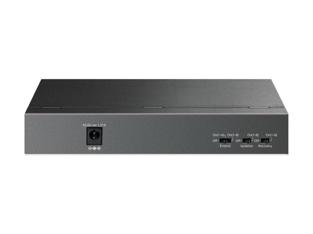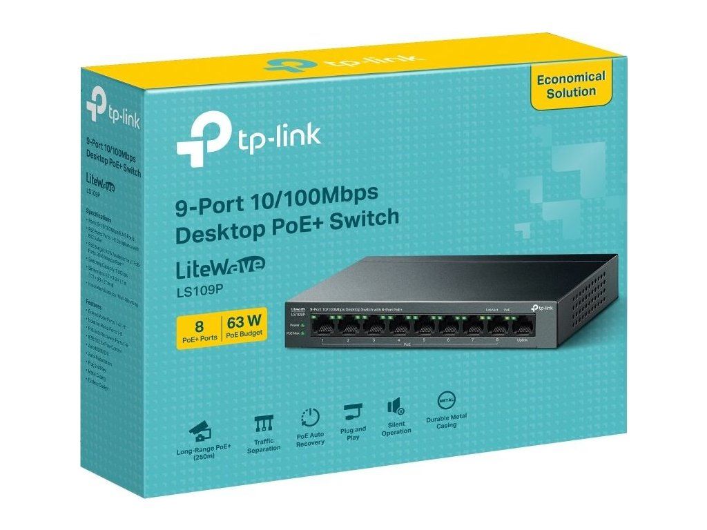 Niezarządzalny przełącznik PoE od TP-Link z(9) 10/100 Mb/sz czego 9. port bez PoE może służyć jako łącze w górę, a pozostały8 portów obsługuje wyjście PoEze standardem 802.3af (do 15,4 W/port) i przeznaczone są do zasilania kamer IP, punktów dostępowych Wi-Fi, VoIP i wielu innych urządzeń o łącznej mocyBudżet PoE 63 W.