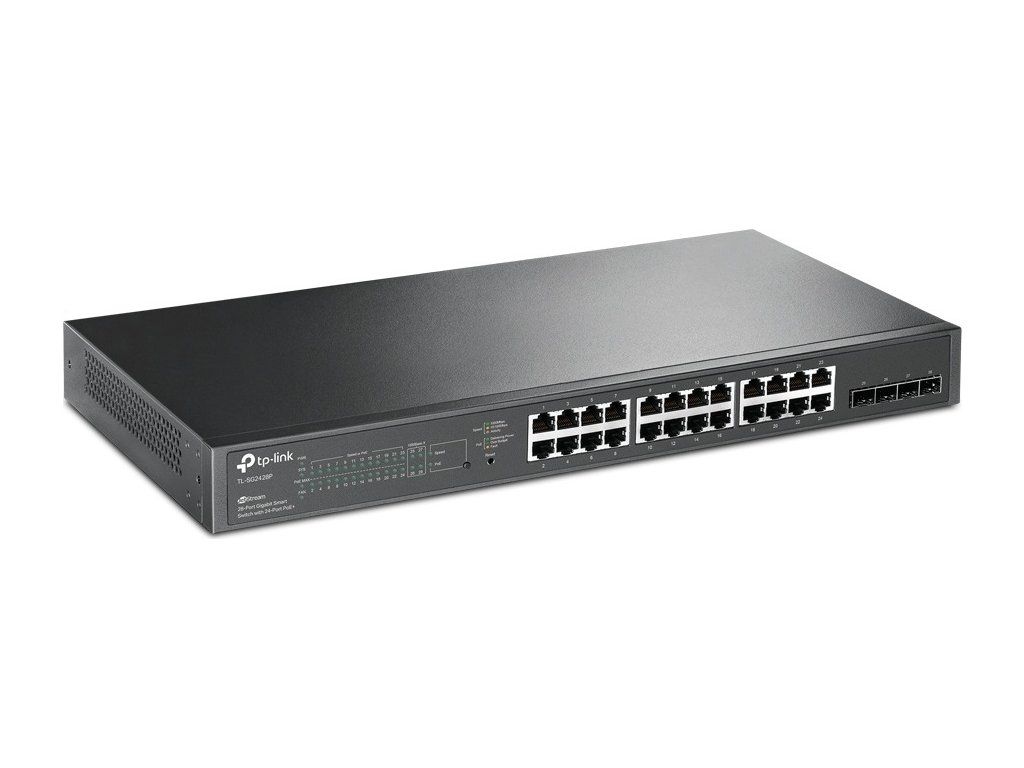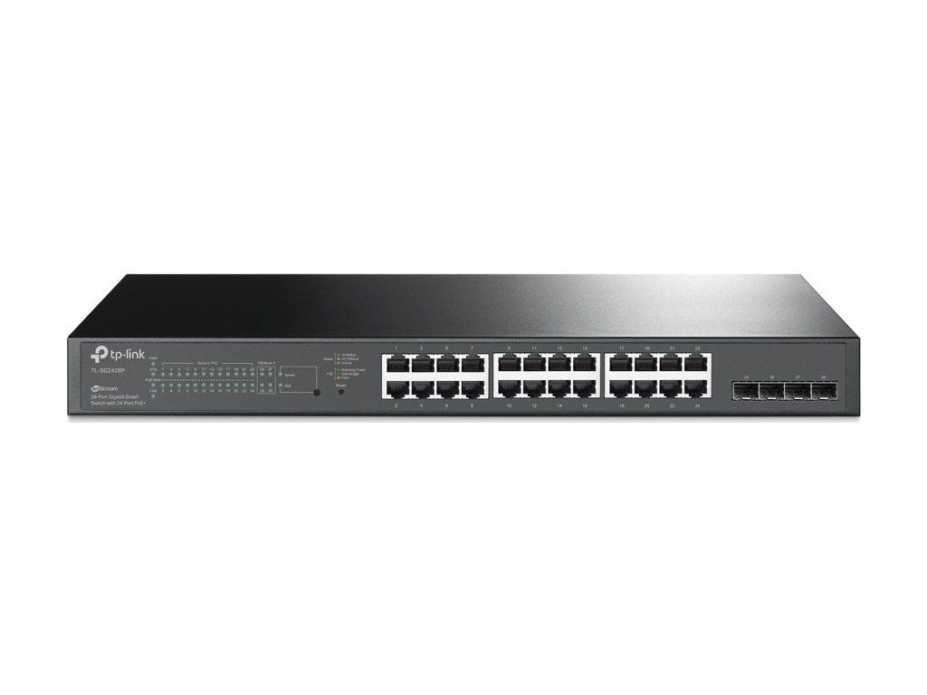 Przełącznik PoE Jetstream TL-SG2428P firmy TP-Link tozarządzalny przełącznik L2 z funkcją PoEZawiera 24 gigabitowe porty LAN z funkcją PoE 802.3af/at oraz 4 dodatkowe gigabitowe porty SFP. Przełącznik dysponuje całkowitym budżetem PoE do zasilania urządzeń za pomocą kabla 250 W. Przełącznik można zamontować w szafie 19", a chłodzenie zapewniają 2 wentylatory boczne.