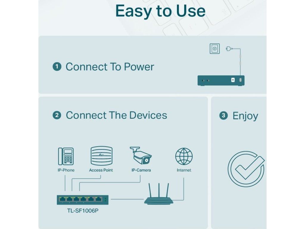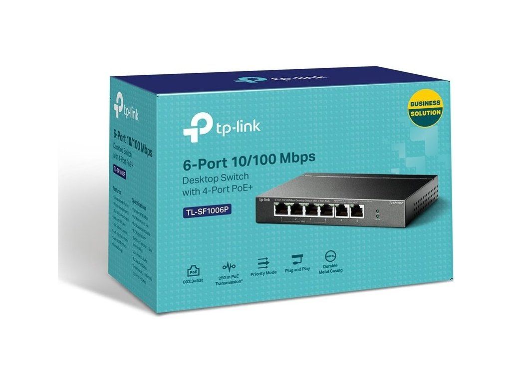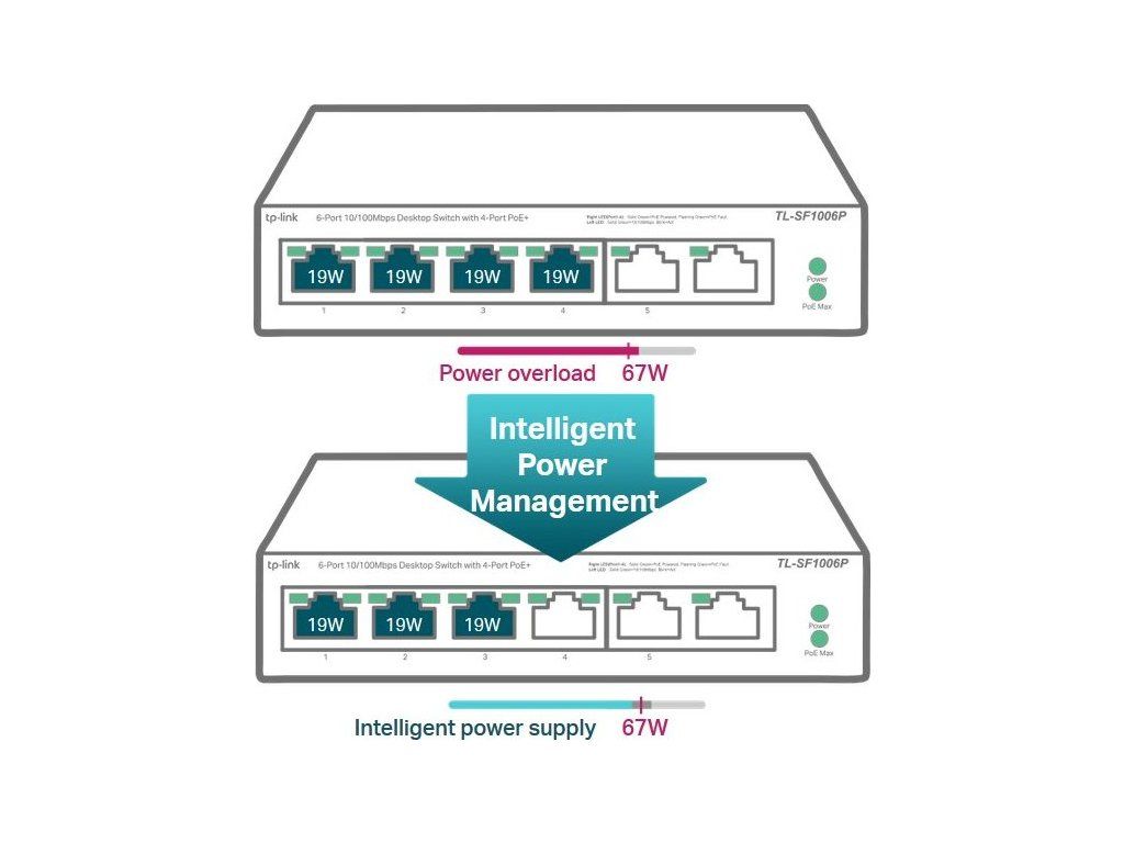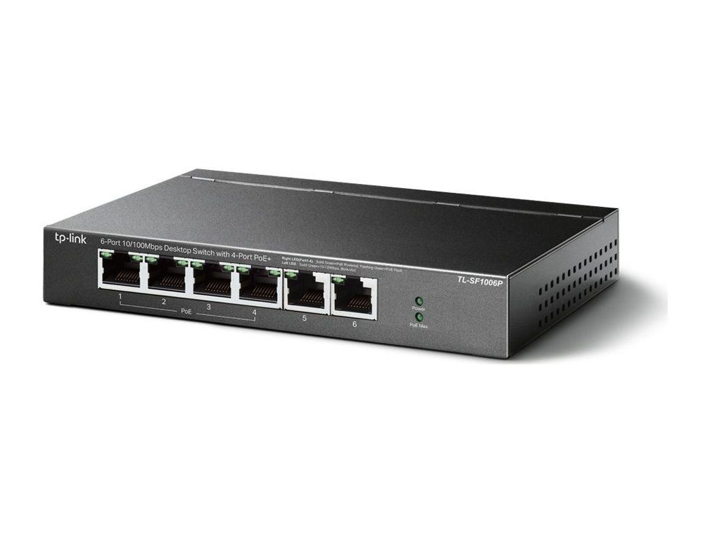 Przełącznik PoE TP-Link TL-SF1006P to niezarządzalny przełącznik PoE z6x 10/100 Mb/sz których tylko4 porty obsługują PoE-Outze standardem 802.3af/at (do 30 W/port). Całkowity budżet PoE przełącznika wynosi67 WPrzełącznik pozwala równieżPoE w odległości 250 mPo przełączeniu specjalnego przełącznika, prędkość łącza na portach PoE spada do 10 Mb/s, co jest więcej niż wystarczające do przesyłania obrazu z kamer. Dodatkowym atutem przełącznika są porty priorytetowe i inteligentne zarządzanie energią (Power Management), umożliwiające odłączenie urządzeń PoE w przypadku niewystarczającego budżetu PoE.
