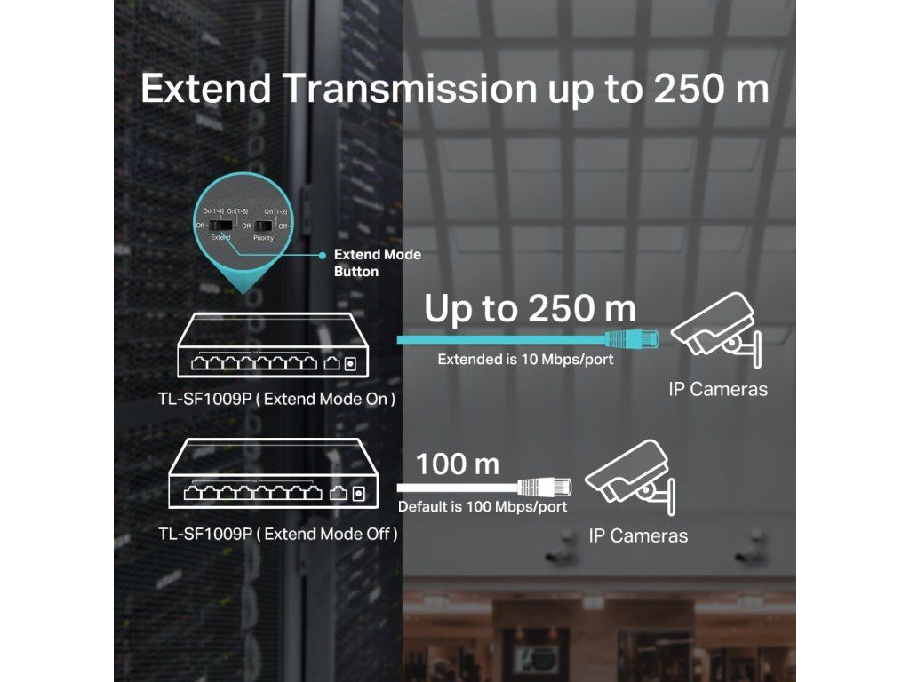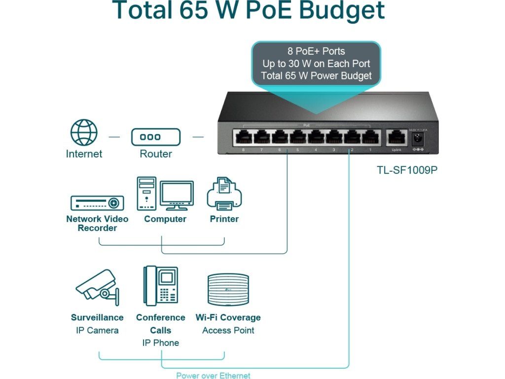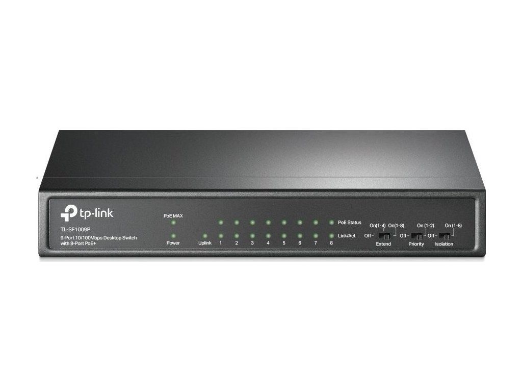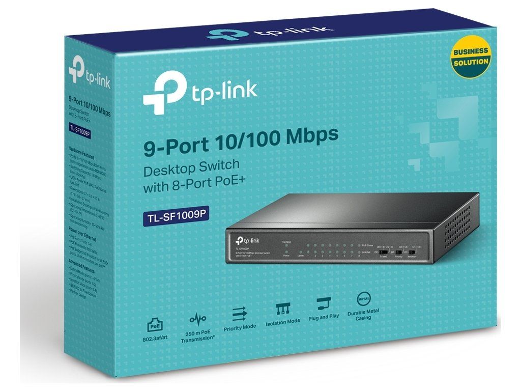 Przełącznik PoE TP-Link TL-SF1009P to niezarządzalny przełącznik PoE z9x 10/100 Mb/sjeden z nich jest oznaczony jako Uplink bez możliwości PoE, a reszta8 obsługuje PoE-Outze standardami 802.3af/at (do 30 W/port). Całkowity budżet PoE przełącznika wynosi65 WPrzełącznik umożliwia równieżPoE w odległości 250 mPodczas przełączania specjalnego przełącznika, prędkość łącza na portach PoE spada do 10 Mb/s, co jest więcej niż wystarczające do przesyłania obrazu z kamer. Innymi zaletami przełącznika są izolacja poszczególnych portów PoE oraz porty priorytetowe 1 i 2.