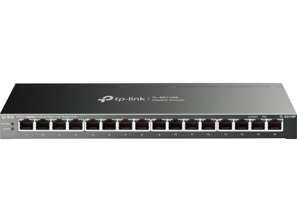 TP-Link TL-SG116P to niezarządzalny przełącznik PoE do komputerów stacjonarnych, przeznaczony do przełączania i zasilania urządzeń aktywnych, takich jak kamery, punkty dostępowe Wi-Fi i podobne urządzenia. Przełącznik jest wyposażony w16 sieci LAN 10/100/1000 Mb/sporty z obsługą 802.3af/at (maks. 30 W/port) PoE na wszystkich portach i łącznieBudżet PoE 120 W. Na portach 1-4 obsługuje również funkcjęPoE dalekiego zasięgu, która umożliwia zasilanie i komunikację na odległość do 250 m, co jest możliwe dzięki obniżeniu prędkości łącza do 10 Mbps.
