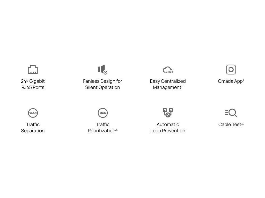 Administracja centralna poprzezChmura OmadaZa pośrednictwem interfejsu webowego lub aplikacji mobilnej umożliwia wygodne monitorowanie i konfigurację z dowolnego miejsca. Przełącznik jest wyposażony w funkcje automatycznego zapobiegania powstawaniu pętli oraz IGMP Snooping, które poprawiają wydajność ruchu sieciowego i zapobiegają awariom. Duża tablica MAC o pojemności 8 tys. adresów i obsługa ramek do 15 KB zapewniają kompatybilność nawet z dużymi strukturami sieciowymi.