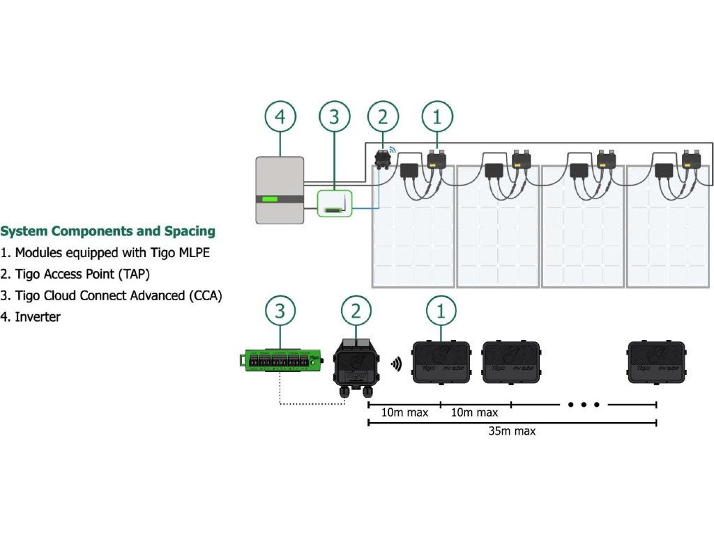 Punkt dostępowy Tigo (TAP) jest kluczowym elementem systemudo optymalizacji modułów fotowoltaicznych, który odbiera dane z optymalizatorówdo 10 metrówa najdalej do 35 metrów. W przypadku większego pola możliwe jest dodanie kolejnych TAP-ów, każdymoże komunikować się z maksymalnie 300 jednostkami TS4. TAP współpracuje z Cloud Connect Advanced (CCA), któryzapewnia szczegółowy monitoringi lepsze bezpieczeństwo przy dezaktywacji na poziomie modułu.Instalacja jest łatwa, bez użycia narzędzi, a maksymalny zasięg do jednostki TS4 wynosi 35 metrów. Jest ona podłączona do jednostki TAP pomocniczej 4-żyłowym kablem o przekroju 18-22AWG.