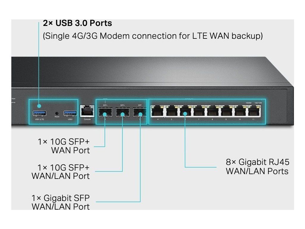 - (1) 10G SFP+ WAN, (1) 10G SFP+ WAN/LAN, (1) 1G SFP WAN/LAN, (8) Gigabit LAN/WAN