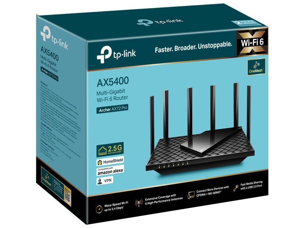 Archer AX72 Pro to dwupasmowy router Wi-Fi 6 firmy TP-Link, który oferuje:4× 10/100/1000 Mb/s sieci LAN, 1× 10/100/1000/2500 Mb/s WAN i 6 stałych anten. Część bezprzewodowa może pracować w dwóch pasmach jednocześnie z prędkością574 Mb/s przy 2,4 GHzzespół i4804 Mb/s w paśmie 5 GHzRouter obsługuje IPv4 i najnowszy routing IPv6. Oprócz najczęściej używanego trybu routera AP, router obsługuje również tryb punktu dostępowego.