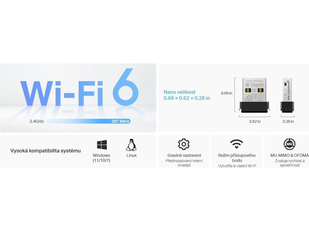 UltrakompaktowyAdapter USB Wi-Fi 6od TP-Link zapewnia szybkie i stabilne połączenie z siecią bezprzewodową. Obsługuje nowoczesneStandard 802.11axz częstotliwością 2,4 GHz i prędkością do287 Mb/s, co zapewnia płynne surfowanie, strumieniowanie online i pracę w chmurze. Idealny do modernizacji komputera stacjonarnego bez modułu Wi-Fi. Dzięki szerokiej kompatybilności z systemami Windows (11/10/7) i Linux (Kernel 3.10+) gwarantuje łatwą instalację i bezproblemowe działanie. Dyskretna konstrukcja pozwala na pozostawienie adaptera w porcie USB bez obaw o zakłócenia.