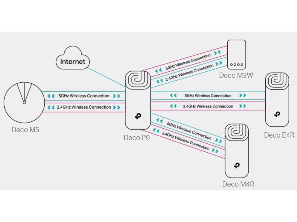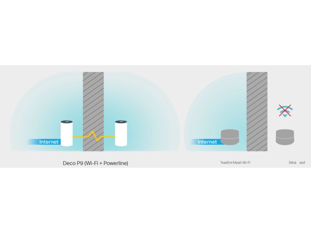 Deco P9 łączy w sobie podwójne Wi-Fi i Powerline, tworząc silniejszą sieć mesh. Technologia Powerline wykorzystuje domową instalację elektryczną, aby zapewnić silniejsze połączenie między urządzeniami Deco, redukując wpływ ścian i innych przeszkód na sygnał, zapewniając jeszcze większą prędkość sieci i prawdziwie płynny zasięg.