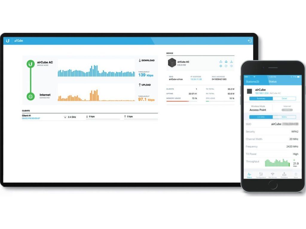 Dostawca usług internetowych AirCube todomowy punkt dostępowy/router o nowoczesnym designieoraz bardzo mocny i dyskretny system antenowy ukryty pod plastikową obudową. Matowo-czarna obudowa routera uzupełnia elegancki wygląd.podstawa podświetlana na biało.
