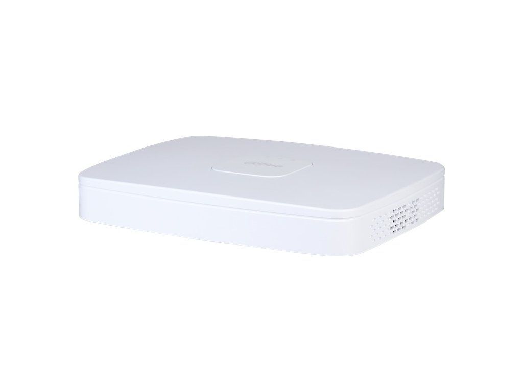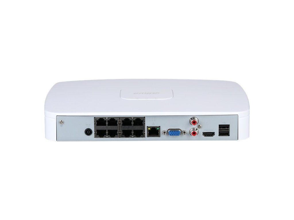 Rejestrator IP 8 kanałów, Smart H.265+, H.265, Smart H.264+, H.264, MJPEG; 144 (72 AI On) Mbps przychodzące, 144 (72 AI On) Mbps nagrywające, 72 (36 AI On) Mbps wychodzące; rozdzielczość kamery maks. 12 Mpx;Funkcje AI w NVR: SMD Plus 4 kanały; Funkcje AI z kamer: Ochrona obwodowa, SMD Plus; 1x SATA maks. 20 TB na 1 dysk; Audio RCA I/O 1/1; 2x USB 2.0, 1x HDMI, 1x VGA, 1x 10/100/1000 port RJ-45, 8x RJ-45 10/100 PoE+ (802.3af/at), łącznie maks.: 72 W, jeden port 25,5 W; zasilanie 53 V DC / 1,81 A, pobór mocy maks. 82 W (bez HDD), temperatura pracy od -10 °C do +55 °C, waga 0,68 kg, wymiary 270 x 206,3 x 45,9 mm.