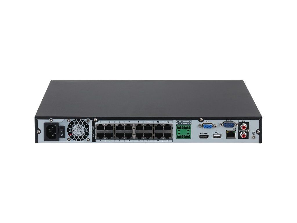 Rejestrator wideo IP 16 kanałów, kodowanie Smart H.265+ / H.265 / Smart H.264+ / H.264, AI wyłączona: 160 Mb/s przychodzące, nagrywanie 160 Mb/s, 80 Mb/s wychodzące, AI włączona: 80 Mb/s przychodzące, nagrywanie 80 Mb/s, 60 Mb/s wychodzące,rozdzielczość kamery maks. 12 Mpx, funkcje AI w NVR: SMD Plus 4 kanały, funkcje AI z kamer: ochrona obwodowa 6 kanałów, wykrywanie twarzy 6 kanałów, rozpoznawanie twarzy 6 kanałów, SMD Plus 6 kanałów, 16x port RJ-45 PoE (IEEE 802.3 af/at), maksymalna moc całkowita 130 W i 25,5 W na port, 2x SATA Maks. 20 TB na 1 dysk, RS-232, Audio RCA I/O 1/1, Alarm I/O 4/2, 1x wyjście 12 V / 1 A, 2x USB 2.0, 1x HDMI, 1x VGA, 1x port 10/100/1000 RJ-45, zasilanie 100-240 V AC 50/60 Hz, temperatura pracy od -10 °C do +55 °C, waga 2,6 kg, wymiary 375,0 x 327,9 x 53,0 mm