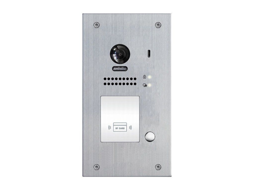 Jednostka drzwiowa, wideo, 1 przycisk i RFID EM 125 kHz, antywandalowa,podświetlana etykieta imienna, konstrukcja ze stali nierdzewnej, białe oświetlenie LED skanowanego obszaru, kolorowa kamera,Kąt widzenia 170°, stopień ochrony IP 43, 12 V DC / 300 mA lub przekaźnik NO/NCsterowanie 1 śluzą (możliwość dołożenia modułu RLC dla 2 śluzy), regulowany czas otwarcia 1-99 sekund, wymiary 119 x 220 x 52 mm, montaż podtynkowy, puszka montażowa metalowa elementów (wymiary puszki 104 x 208 x 43 mm), zasilanie 24 V DC z magistrali systemowej, układ połączeń dwużyłowy - niepolaryzowany, zalecana skrętka nieekranowana min. 2x 1 mm