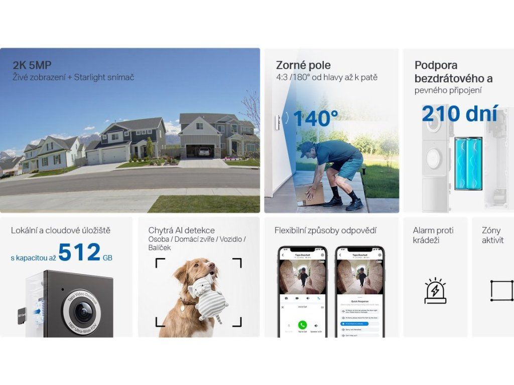 Bezprzewodowy wideodomofon z kamerą TP-Link do montażu na zewnątrz zapewnia bezpieczeństwo i wygodę. Dziękirozdzielczość 5 Mpx akąt widzenia 170°rejestruje każdy szczegół, a czujnik StarLight umożliwia towidzenie nocne w kolorzeAlerty dotyczące osób, pojazdów, zwierząt domowych i przesyłek zapewniają dokładne wykrywanie bez żadnych opłat. Elastyczne zasilanie za pośrednictwemBateria 10 000 mAhz baterią o żywotności do 210 dni lub listwą zaciskową AC, zapewnia wszechstronne możliwości instalacji. Przechowywanie naKarta microSD do 512 GBa chmura Tapo ułatwia przechowywanie nagrań. Połączenie Wi-Fi 2,4 GHz zapewnia niezawodną łączność podczas codziennego użytkowania.