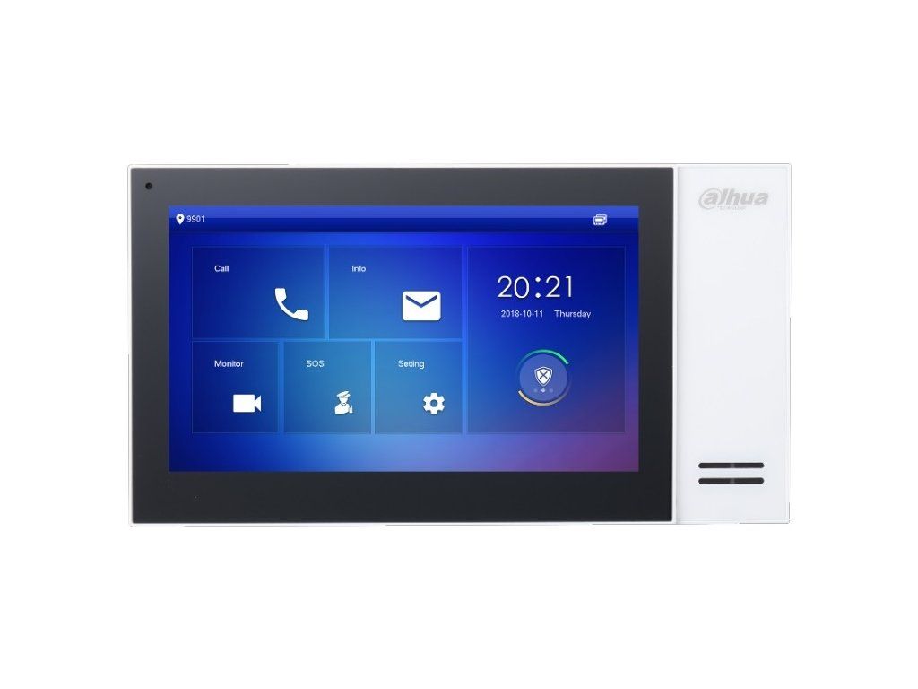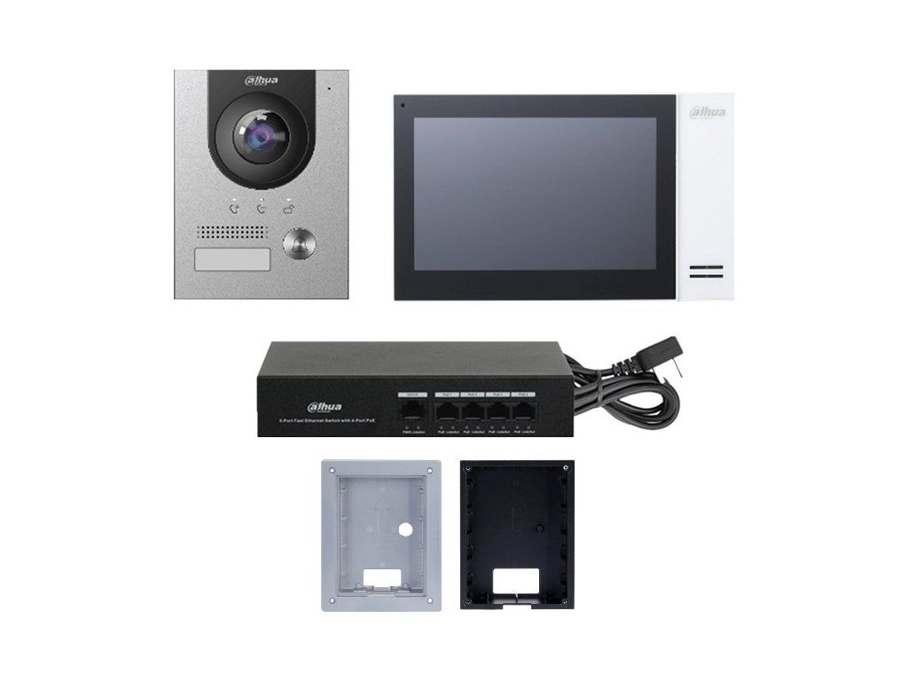 Zestaw instalacyjny Dahua TCP/IP, zestaw zawiera monitor VTH2421FW-P, 7-calowy kolorowy wyświetlacz dotykowy LCDo rozdzielczości 1024 x 600 px, wymiarach 221 x 120 x 22 mm,jednostka drzwiowa VTO2201F-P, 1 przycisk mechanicznyKamera CMOS 2Mpx, kąt widzenia 180°, 1x sterowanie blokadą, możliwość rozszerzenia o drugą blokadę za pomocą DEE1010 (brak w zestawie), IP 65, wymiary 130 x 96 x 29 mm, puszka montażowa VTM114, zasilanie systemu za pomocą przełącznika PoE PFS3005-4ET-36E (w zestawie), obsługa podglądu kamer Dahua, wywoływanie aplikacji mobilnej Dahua DMSS