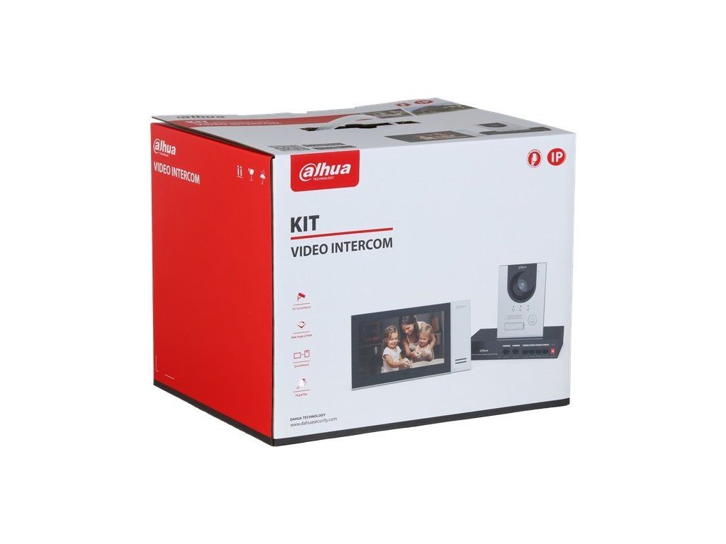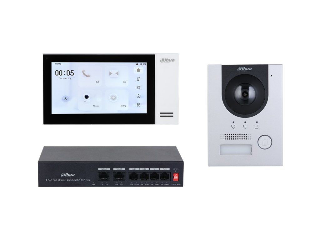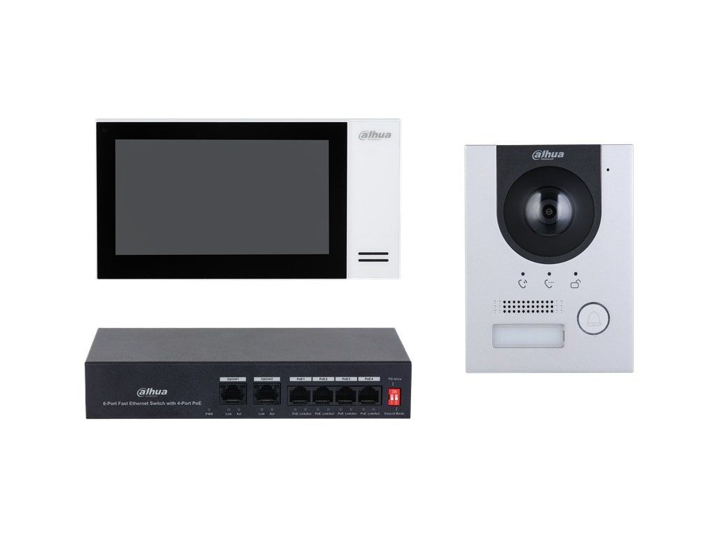 Dahuazestaw instalacyjnyTCP/IP, zestaw zawiera przełącznikPFS3006-4ET-36, monitorVTH2421FW-P, 7-calowy kolorowy wyświetlacz dotykowy LCD o rozdzielczości 1024 x 600 px, wymiary 119,6 × 221,5 × 21,5 mm, jednostka drzwiowaVTO2201F-P-S2, 1 przycisk mechaniczny, kamera CMOS 2Mpx, kąt widzenia168,6°,1x 12V DC/600mAwyjście do sterowania zamkiem, możliwość sterowania drugim zamkiem poprzezDEE1010B-S2(nie dołączone), Ik07 i IP65, wymiary 130 × 96 × 28,5 mm, kompatybilne zVTM114 aVTM115, zasilanie systemu poprzez Switch PFS3006-4ET-36 (w zestawie) lub zgodnie ze standardem 802.3.af/802.3at (przy użyciu wyjścia 600mA), obsługa podglądu z kamer Dahua, połączenie do aplikacji mobilnejDahua DMSS