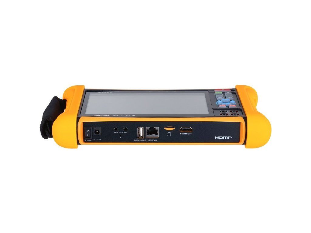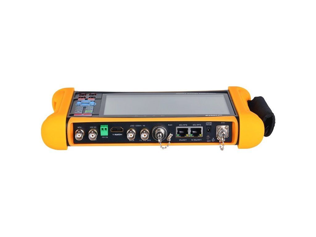 Android, klawisze sterujące, 7-calowy ekran dotykowy IPS Full HD, światło LED, Wi-Fi 2.4G / 5.8GIEEE 802.11 a/b/g/n/ac;Funkcje: Test IPC, test wideo analogowego, test SDI, sterowanie RS-485, test kabla, DMM (multimetr cyfrowy), test HDMI, test napięcia, test audio; Porty: 1x wejście 12V DC (port ładowania), 1x wyjście zasilania 12V DC / 2A, 1x wejście audio, 1x wyjście audio, 1x port USB A, 2x RJ-45 10/100/1000M (1x PoE, 1x funkcja PSE IN), 1x interfejs UTP/SCAN (RJ-45), 1x Micro SD do 32 GB, 1x wyjście HDMI, 1x wejście HDMI, 1x RS-485, 1x VLS, 4x BNC, 1x OPM, 4x multimetr; ONVIF;Zintegrowana bateria o pojemności 37 Wh i średnim czasie pracy 8 godz., wytrzymała obudowa, waga 0,95 kg, wymiary 270 x 160 x 46 mm, temperatura pracy od -10 °C do +55 °C